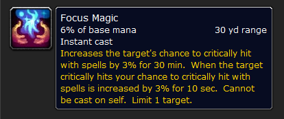 There are also buffs that can be provided to a raid that are not meant for the entire raid to have or to be able to enjoy. Whereas the above mentioned buffs can be distributed pretty evenly to those in need, certain buffs can involve some amount of discussion and even competition for those resources. These buffs can include, but are not limited to Power Infusion, Hysteria and Focus Magic. One of the more highly coveted buffs, Focus Magic is a buff provided by arcane mages and works as follows:
